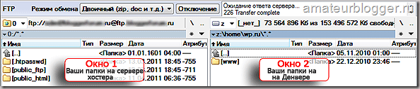 Як видно з скрін, в Вікні 1 знаходяться папки, які створив для нас хостер для нашого сайту. Нічого нового тут створювати не потрібно. У Вікні 2 - наша папка з сайтом, який ми збираємося перенести на хостинг.