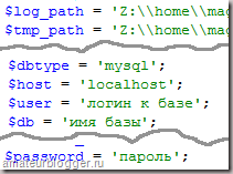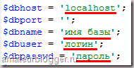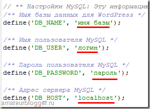 Зверніть увагу, що всі все файли між собою досить схожі. Скрізь є поле, для вказівки імені бази, логіна, пароля. Я спеціально виділила ще адресу бази localhost. Як правило, адреса бази завжди має саме цю назву.