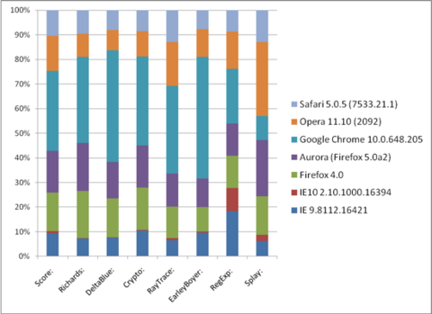 У синтетичному тесті V8 (версії 6) браузери отримали наступні результати (на діаграмі сума можливих балів за тест дорівнює 100%):