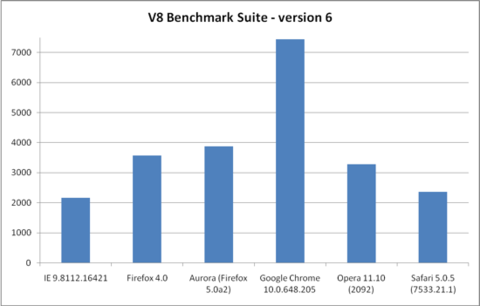 Chrome впевнено лідирує, перевершуючи за кількістю балів IE9 майже в 3,5 рази (7438 проти 2170). Попередня версія IE10 отримала найгірший результат як в цьому, так і в усіх інших тестах. Можна з упевненістю сказати, що поки що IE10 користуватися не варто. А ось Aurora, навпаки, демонструє відмінні результати і набирає більше балів, ніж поточна версія Firefox 4 (3883 проти 3578). Таким чином, якщо не брати до уваги IE10 PP, Internet Explorer 9 демонструє найнижчу продуктивність серед учасників тесту V8 Benchmark.