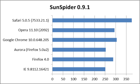 Тест SunSpider 0.9.1 дозволяє оцінити продуктивність браузерів за часом, витраченому на проходження тесту. У цьому тесті все браузери показали порівнянні результати. Єдиний виняток - IE10, чий результат виявився в сімнадцять разів нижчий за результат поточної версії Internet Explorer.