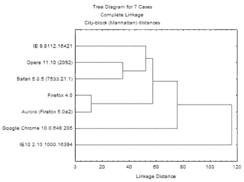 За результатами кластерного аналізу можна виділити чотири кластери. Перший кластер включає в себе тільки IE10. Через значних відмінностей практично за всіма показниками попередня версія IE10 потрапляє в окремий кластер зі значним відставанням у всіх тестах (підсумковий результат 77 runs / s).