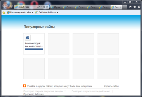 Захист від стеження. У тому ж меню "Сервіс" можна виявити і так званий приватний режим. В Internet Explorer він називається InPrivate і практично ідентичний аналогам в інших браузерах. Сторінки, відвідувані в такому режимі, не відслідковуються в вікні нової вкладки і не зберігаються в історії відвідувань. Режим InPrivate відкривається в новому вікні; відкрити приватну вкладку і розмістити її поруч зі звичайними вкладками можна.