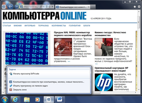 Інтеграція з системою. IE9 активно використовує можливості, що надаються Windows 7. Сайти можна закріпити на панелі завдань робочого столу - для цього достатньо просто перетягнути вкладку на панель задач. Відкриті вкладки доступні для попереднього перегляду через панель додатків. Варто, втім, зауважити, що це зручно лише до тих пір, поки їх мало.