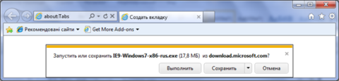 При цьому, на відміну від Opera або Chrome, тут оформлення вікна браузера не залежить від його розміру, тобто IE9 не економить місце при розкритті вікна на весь екран. Правда, можна скористатися повноекранним режимом, але це не завжди зручно. Проблему можна частково вирішити, якщо винести панель вкладок на окремий рядок (ця опція ховається в контекстному меню самої вкладки; там же можна виявити і популярну функцію "відкрити закриту раніше вкладку").