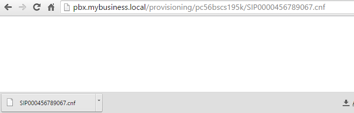Лише один раз вам буде потрібно файл SIPdefault.cnf в кореневій папці TFTP сервера. Для створення файлу, скопіюйте "Provisioning Link" додаткового номера і замініть SIPXXXXXXXXXXXX.cnf на SIPDefault.cnf. "Http: //pbx.mybusiness.local/provisioning/pc56bscs195k/SIPDefault.cnf"